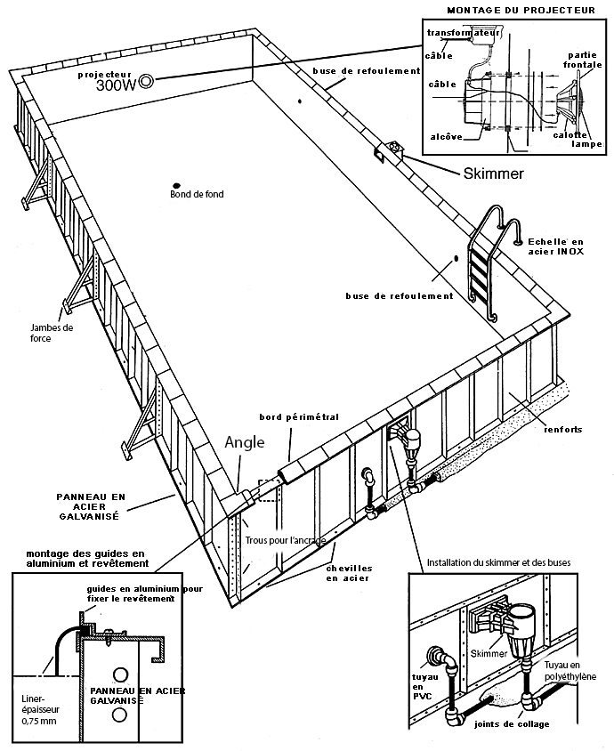 Les panneaux sont pré-coupés pour l’installation et l’ancrage du skimmer, des buses de refoulement et des accessoires inclus dans l’équipement.