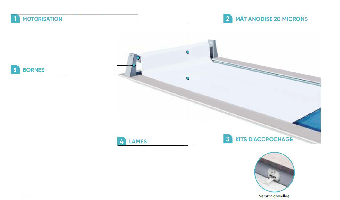 Le Tablier est composé de lames PVC sans adjuvant au plomb (matière conforme aux exigences de résistance au vieillissement définies dans la norme NF T 54 405-1), elles sont étanches et articulées entre elles, et flottent à la surface de l’eau.